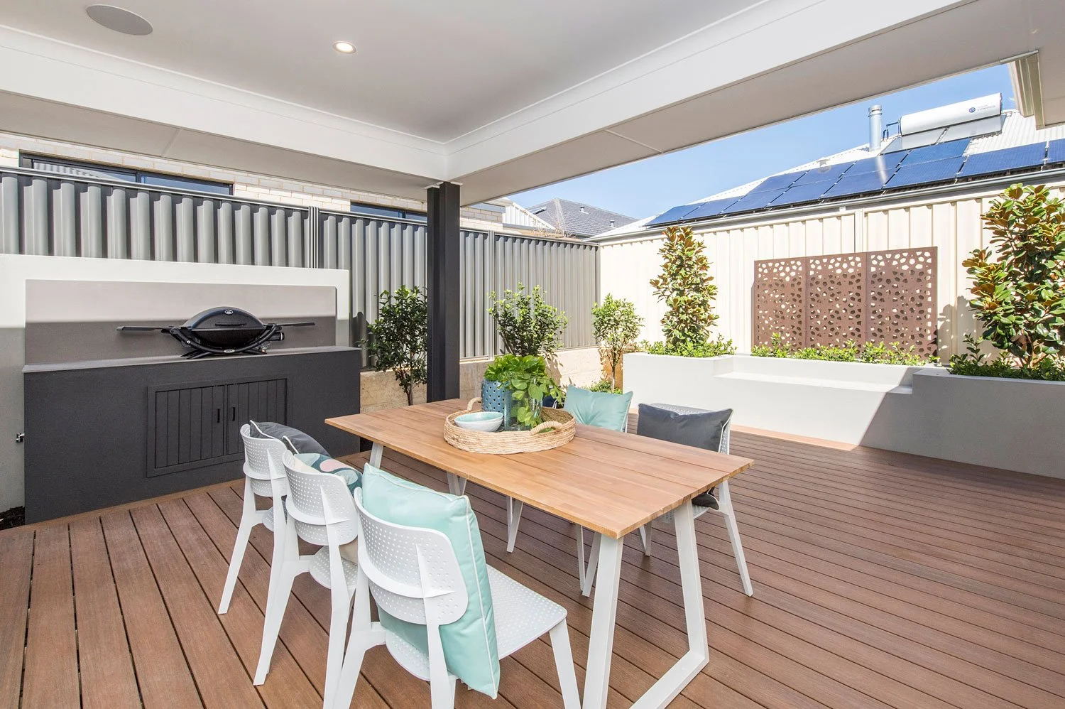 Exterior selections: roof, paint, feature brick, windows, garage, lighting, decking.